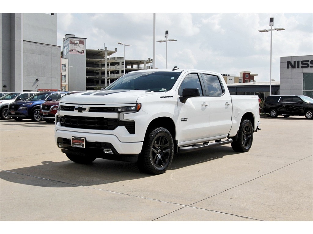 Central Houston Nissan is proud to present you with another True Market Priced Pre-Owned Vehicle. This 2023 Chevrolet Silverado 1500 RST is loaded with the following Factory Options: 10-Speed Automatic, 4WD, and Black Cloth Convenience Package (10-Way Power Driver Seat w/Lumbar, 120-Volt Bed Mounted Power Outlet, 120-Volt Instrument Panel Power Outlet, Dual Rear USB Ports (Charge Only), Dual-Zone Automatic Climate Control, Electric Rear-Window Defogger, Heated Driver & Front Outboard Passenger Seats, Heated Steering Wheel, Keyless Open & Start, Remote Vehicle Starter System, Theft Deterrent System (Unauthorized Entry), and Wrapped Steering Wheel), Convenience Package II (Hitch Guidance w/Hitch View, Integrated Trailer Brake Controller, Power Sliding Rear Window w/Rear Defogger, Premium Bose 7-Speaker Sound System, Trailering App, and Universal Home Remote), High Capacity Suspension Package, Preferred Equipment Group 1SP (12.3" Multicolor Reconfigurable Digital Display, 6-Speaker Audio System, All-Star Edition, Auto-Locking Rear Differential, Bluetooth® For Phone, Chevrolet Connected Access Capable, Color-Keyed Carpeting Floor Covering, Compass, Deep-Tinted Glass, Electrical Steering Column Lock, Electronic Cruise Control, EZ Lift Power Lock & Release Tailgate, Front Frame-Mounted Black Recovery Hooks, Front LED Fog Lamps, Front Rubberized Vinyl Floor Mats, HD Rear Vision Camera, Heated Power-Adjustable Outside Mirrors, High Gloss Black Mirror Caps, Inside Rear-View Mirror w/Tilt, LED Cargo Area Lighting, OnStar & Chevrolet Connected Services Capable, Power Front Windows w/Driver Express Up/Down, Power Front Windows w/Passenger Express Down, Power Rear Windows w/Express Down, Rear 60/40 Folding Bench Seat (Folds Up), Rear Rubberized-Vinyl Floor Mats, SiriusXM w/360L, Standard Tailgate, Steering Wheel Audio Controls, Wi-Fi Hot Spot Capable, and Wireless Phone Projection), Protection Package (Chevytec Spray-On Black Bedliner and Rear Wheelhouse Liners), Rally Edition (4" Black Round Assist Steps (LPO) and Wheels: 20" x 9" High Gloss Black Painted Alum), Standard Suspension Package, Texas Edition Plus (Texas Edition Badging and Wheels: 20" x 9" Painted Aluminum), Trailering Package (Hitch Guidance), 10-Speed Automatic, 4WD, Black Cloth, 2 USB Data Ports, 220 Amp Alternator, 3.23 Rear Axle Ratio, 4-Wheel Disc Brakes, 40/20/40 Front Split-Bench Seat, 6 Speakers, ABS brakes, Air Conditioning, All-Weather Floor Liner (LPO), Alloy wheels, AM/FM radio: SiriusXM with 360L, Apple CarPlay/Android Auto, Auto High-beam Headlights, Automatic Emergency Braking, Automatic temperature control, Brake assist, Bumpers: body-color, Cloth Seat Trim, Delay-off headlights, Driver door bin, Driver vanity mirror, Dual Exhaust w/Polished Outlets, Dual front impact airbags, Dual front side impact airbags, Electronic Stability Control, Electronic Transmission Range Selector Shifter, Engine Block Heater, Floor Mounted Center Console, Following Distance Indicator, Forward Collision Alert, Front anti-roll bar, Front Bucket Seats, Front Center Armrest w/Storage, Front dual zone A/C, Front fog lights, Front License Plate Kit, Front Pedestrian Braking, Front reading lights, Front wheel independent suspension, Fully automatic headlights, Heated door mirrors, Heated front seats, Heated steering wheel, Illuminated entry, IntelliBeam Automatic High Beam On/Off, Lane Keep Assist w/Lane Departure Warning, Low tire pressure warning, Not Equipped w/Steering Column Lock, Occupant sensing airbag, Outside temperature display, Overhead airbag, Overhead console, Panic alarm, Passenger door bin, Passenger vanity mirror, Power door mirrors, Power driver seat, Power steering, Power Tailgate, Power windows, Premium audio system: Chevrolet Infotainment 3 Premium, Radio data system, Radio: Chevrolet Infotainment 3 Premium System, Rear reading lights, Rear step bumper, Rear window defroster, Remote keyless entry, Security system, Speed control, Speed-sensing steering, Split folding