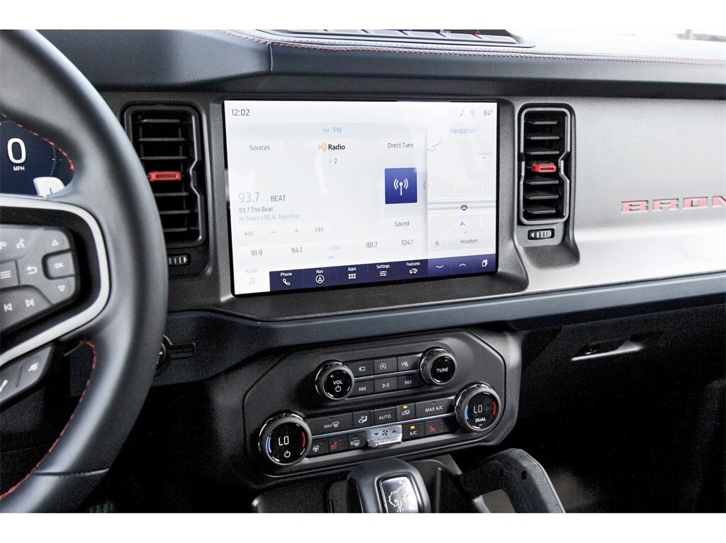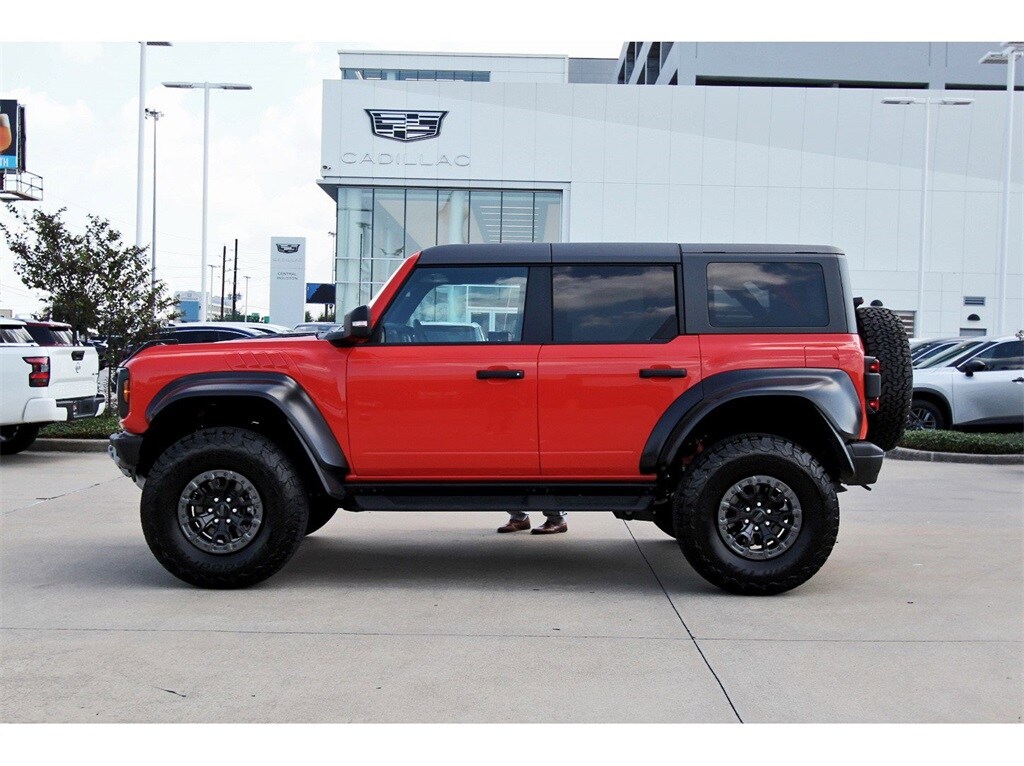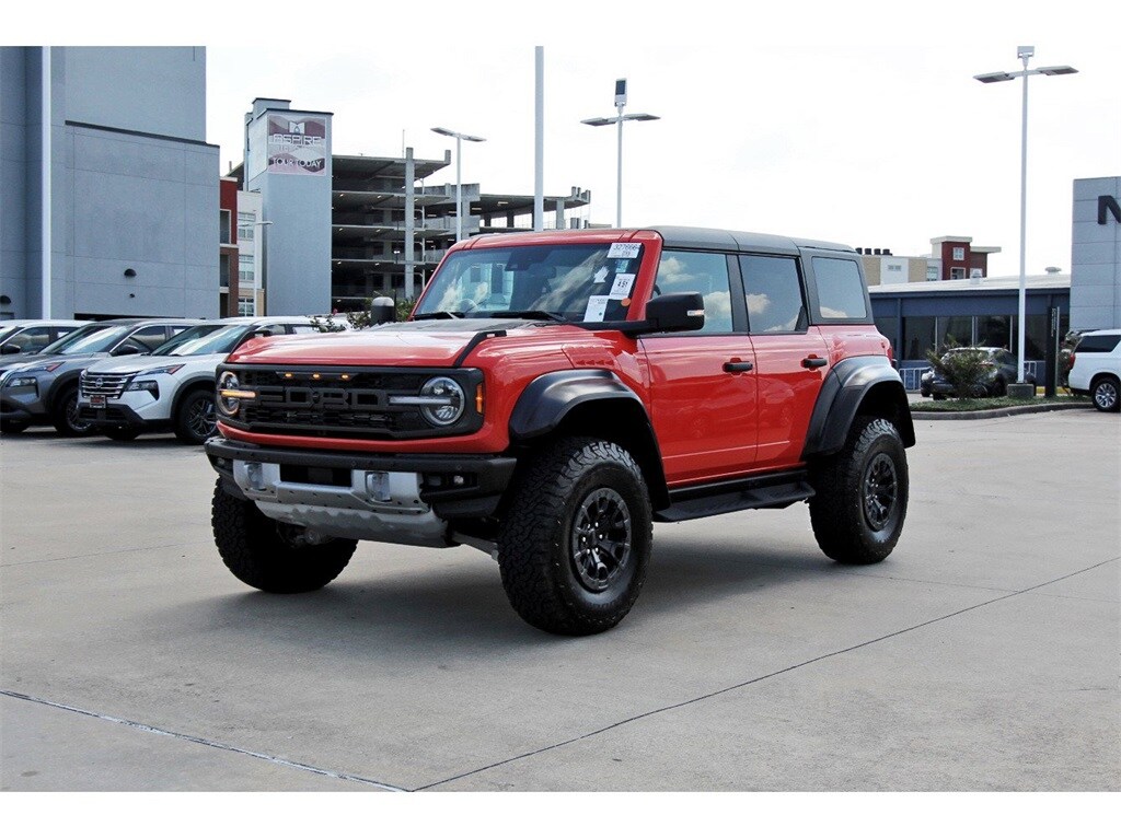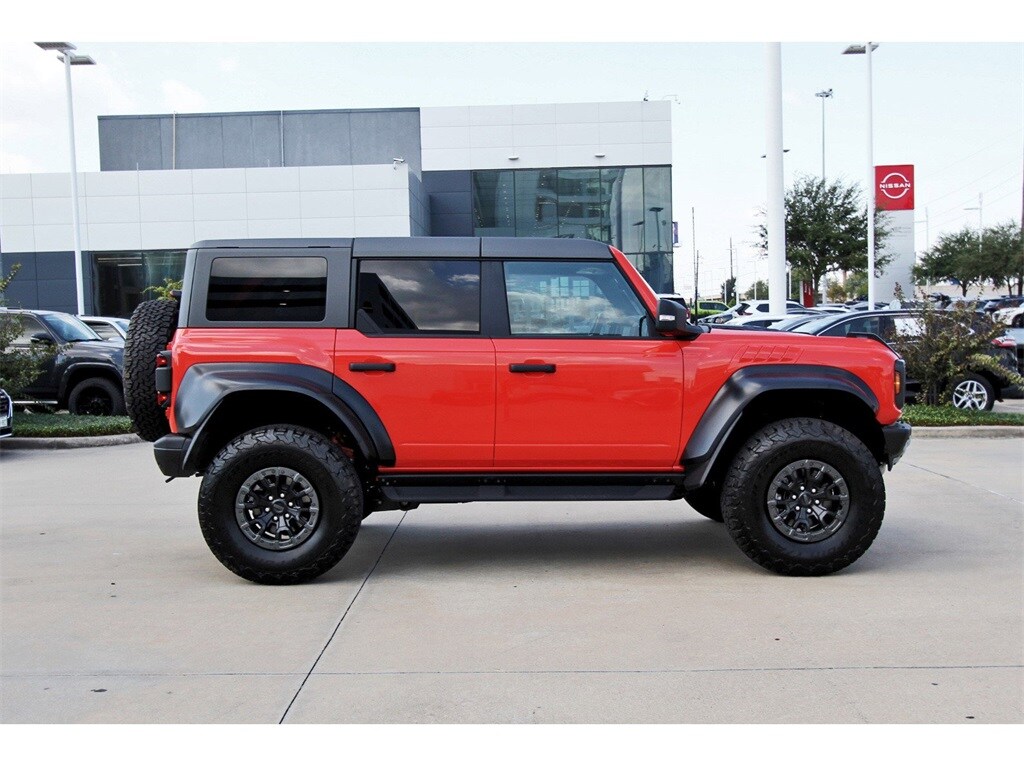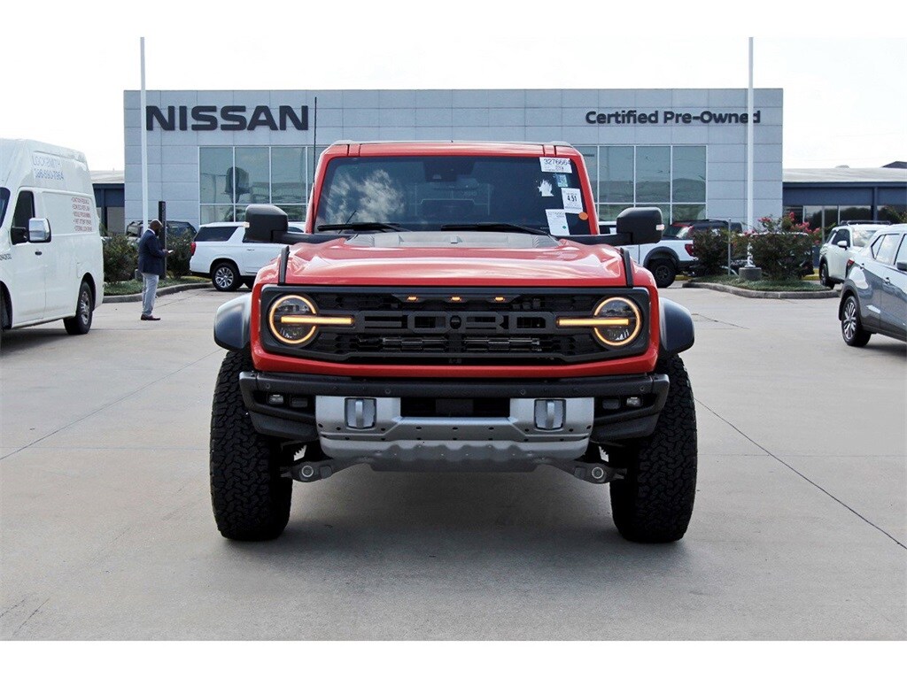 Central Houston Nissan is proud to present you with another True Market Priced Pre-Owned Vehicle. This 2023 Ford Bronco Raptor is loaded with the following Factory Options: Equipment Group 374A Lux Package, Lux Package (10 Speakers w/Subwoofer, 2 Smart Charging USB Ports In Dashboard, Adaptive Cruise Control, Connected Built-In Navigation, Evasive Steering Assist, Heated Steering Wheel, Radio: B&O Sound System by Bang & Olufsen, Universal Garage Door Opener, and Wireless Charging Pad), 4-Wheel Disc Brakes, 4.7 Axle Ratio, 7 Speakers, ABS brakes, Air Conditioning, Alloy wheels, AM/FM radio: SiriusXM with 360L, AM/FM Stereo, Auto High-beam Headlights, Auto-dimming Rear-View mirror, Automatic temperature control, Brake assist, Code Orange Accent Seat Belts, Compass, Connected Navigation, Convertible HardTop, Convertible roof lining, Delay-off headlights, Driver door bin, Driver vanity mirror, Dual front impact airbags, Dual front side impact airbags, Electronic Stability Control, Emergency communication system: 911 Assist, Engine Block Heater, Exterior Parking Camera Rear, Front anti-roll bar, Front Bucket Seats, Front Center Armrest, Front dual zone A/C, Front fog lights, Front reading lights, Front wheel independent suspension, Fully automatic headlights, Glass rear window, Hard Top Sound Deadening Headliner (DISC), Heated door mirrors, Heated front seats, Illuminated entry, Integrated roll-over protection, Leather Shift Knob, Low tire pressure warning, Marine Grade Vinyl Bucket Seats, Navigation system: Connected Navigation, Occupant sensing airbag, Outside temperature display, Overhead airbag, Overhead console, Panic alarm, Passenger door bin, Passenger vanity mirror, Power door mirrors, Power steering, Power windows, Radio data system, Rear anti-roll bar, Rear seat center armrest, Rear window defroster, Rear window wiper, Remote keyless entry, Security system, SiriusXM Radio w/360L, Speed control, Split folding rear seat, Steering wheel mounted audio controls, SYNC 4, Tachometer, Telescoping steering wheel, Tilt steering wheel, Traction control, Trip computer, Turn signal indicator mirrors, Variably intermittent wipers, Voltmeter, Wheels: 17" Black High Gloss-Painted Aluminum, and Wheels: 17" Dark Carbonized Gray Alloy Painted!!
